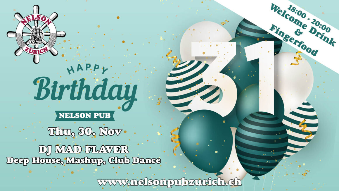 Wir feiern 31 Jahre Nelson Pub Zürich! Unser grosses Jubiläumswochenende geht in die 1. Runde. Superzentral und mitten im schönen Kreis 1, wird gefeiert, dass es nur so kracht. Ab 18 Uhr laden wir alle Nelson Pub Fans zu einem Welcome Drink und Apero Snacks ein. Ab 20 Uhr holt DJ Mad Flaver seine heissesten Platten raus und spielt Deep House, Mashup und Club Dance, bis auch der Hartgesottenste an die Grenzen seiner Tanzwut kommt. Die gemütlichen Lounges laden derweil zum Chillen ein. Happy Birthday Nelson Pub!
