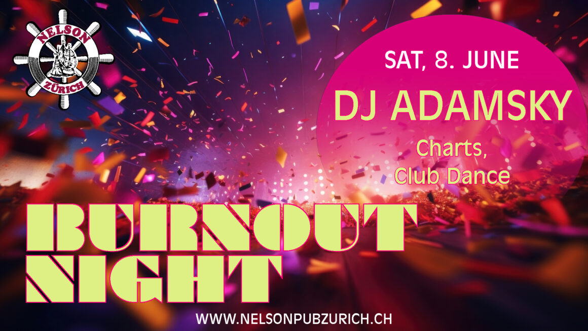 Die Burnout Night im Nelson Pub steht dafür, was sie verhindern will: ein Burnout wegen zuviel Stress. Denn Tanzen gilt als entspannend und Musik hebt die Stimmung. DJ Adamksy  fungiert an den Turns als Oberarzt, der Charts und Club Dance an seine Gäste auch ohne Rezept verteilt.