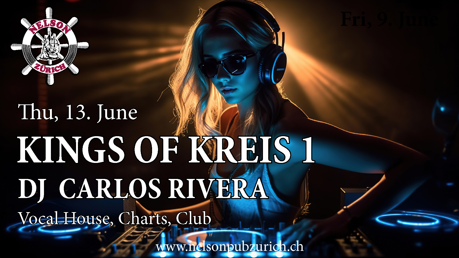 Line Up: DJ Carlos Rivera Soundstile: Vocal House, Charts, Club Heute Abend findet sich bei der Kings of Kreis 1 Sause im Nelson Pub einmal mehr die Crème de la Crème der Bahnhofstrasse und Umgebung zusammen. Kein Wunder, denn DJ Carlos Rivera ist für den Sound verantwortlich. Wer ihn schonmal gehört hat, weiss, warum ihm sein Name vorauseilt, ein Tausendsassa des Nachtlebens zu sein. Heute spielt er Vocal House, Charts und Club. Be prepared...