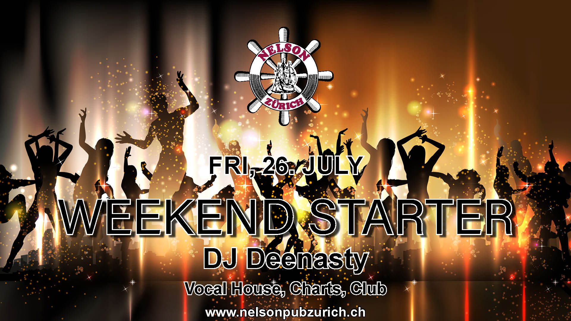 WeiterlesenWeekend Starter Line Up: DJ Deenasty Soundstile: Vocal House, Charts, Club Auf ins Wochenende! Mit der Weekend Starter Sause stehen wir im Nelson Pub schon in den Startlöchern, um furios und spektakulär das Weekend einzuläuten. DJ Deenasty ist der Tausendsassa, der heute an den Decks für exzellenten Sound sorgt. Mit erstklassigem Fingerspitzengefühl lässt er einen Megahit nach dem anderen erklingen. Vocal House, Charts und Club– so viel das Ohr begehrt.